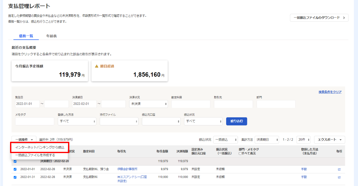 freeeでは、支払管理レポートから総合振込に使用できる全銀ファイルを作成することができます。