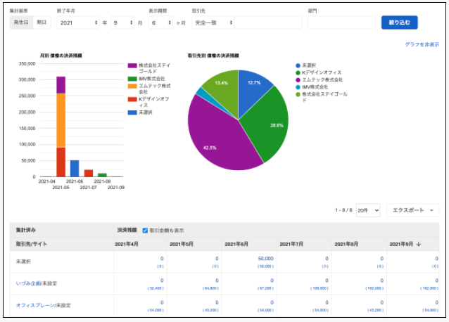また、取引先別の管理や、入金/支払期日超過の確認までレポートにて行えます。