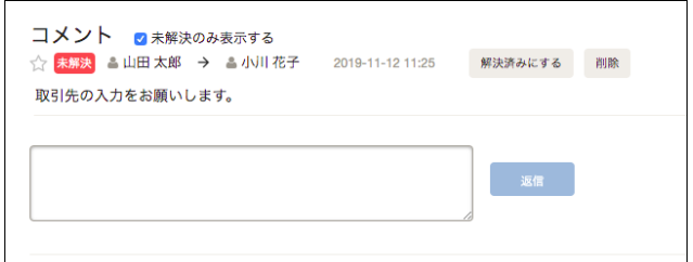 ひとつひとつの取引ごとに特定の人宛にメッセージを送る事ができるため、チェック担当者から入力担当者へ記帳内容の確認や修正依頼をスムーズに行うことができます。