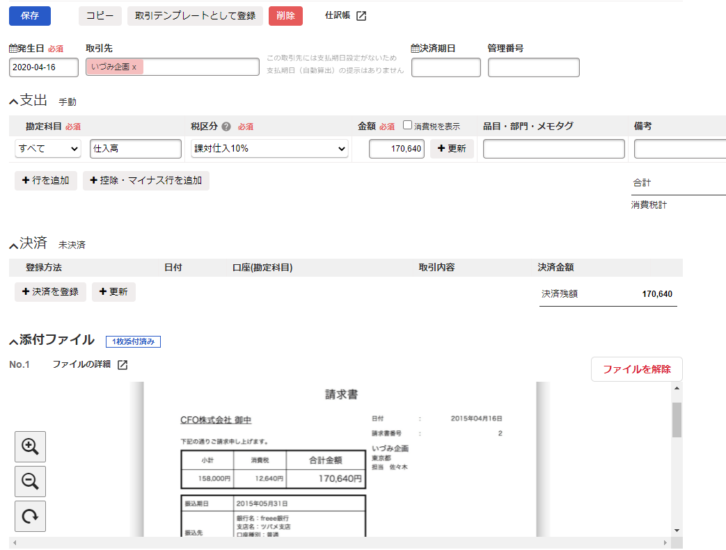 支払請求書を受け取ったら、freeeのファイルボックスに請求書をアップロードするなどし、未決済取引(経費/買掛金 の仕訳)を作成しましょう。