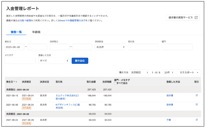 入金管理レポートでは、取引先と入金予定日ごとの一覧と、入金・未入金の別で確認することができます。