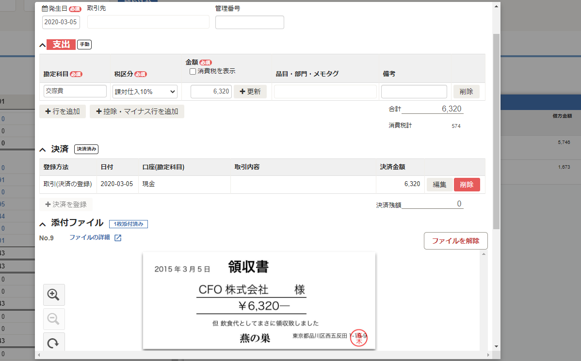 試算表や仕訳帳から取引の詳細を開くと、実際に添付した領収書を見ることができます。